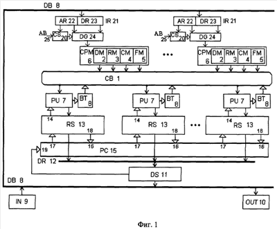 В процессе обработки командный пакет по кольцевой шине передачи командных пакетов СВ 1 достигает операционного блока PU 7, триггер занятости ВТ 8 которого сброшен. Фиксация командного пакета во входных цепях операционного блока PU 7 удаляет его с шины передачи командных пакетов СВ 1 и устанавливает соответствующий триггер занятости ВТ 8, что приводит к перенаправлению других командных пакетов, находящихся на шине передачи командных пакетов СВ 1, к оставшимся операционным блокам PU 7. В случае занятости всех операционных блоков PU 7 командные пакеты циркулируют по шине передачи командных пакетов СВ 1 до сброса одного из триггеров занятости ВТ 8.