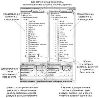 затем извлекают из сохраненных файлов состояний и производят сопоставление дискреционных списков эффективных прав доступа каталогов и файлов, присутствующих в обоих состояниях; при этом в каждом состоянии для каждого каталога или файла отмечают права, которые отсутствуют в таком дискреционном списке эффективных прав доступа этого каталога или файла в другом состоянии.