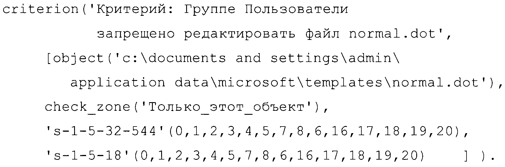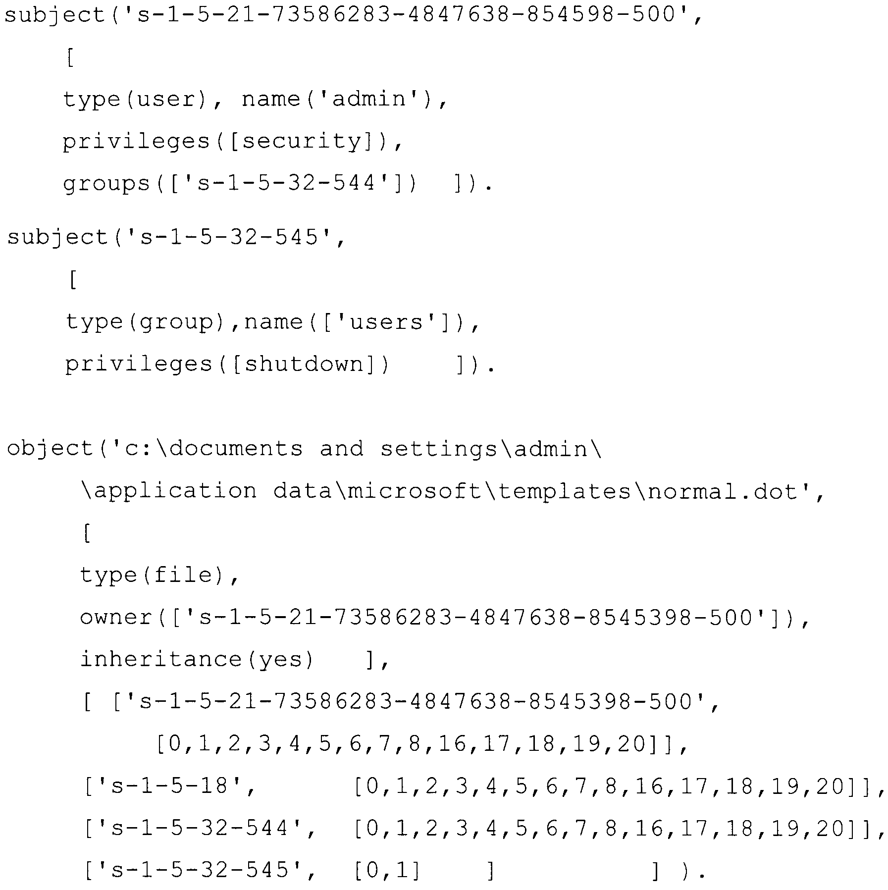 В данном примере заданы предикаты описания пользователя, группы и файла-шаблона. Каждый предикат содержит информацию об идентификаторе субъекта, а также его атрибутах безопасности. Например, первый предикат описывает пользователя admin, его идентификатор безопасности, множество его привилегий и групп; второй – группу Пользователи и ее привилегии; третий – файл normal.dot, идентификатор безопасности владельца, флаг наследования прав и собственно права доступа, заданные в виде дискреционного списка в формате “SID-биты_прав”.