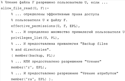 В данном примере право “Чтение” предоставляется, если пользователь имеет эффективное разрешение на чтение, т.е. установленные разрешения “Чтение” и “Чтение атрибутов” в дискреционном списке контроля доступа, или у пользователя есть привилегия резервного копирования, или право предоставлено группам, в которые входит пользователь. Таким образом, выполняется замена значений параметров безопасности системного состояния, определяющих возможность доступа, на соответствующие им значения параметров доступа субъектов к объектам (в данном примере – на эффективное право доступа “Чтение”).