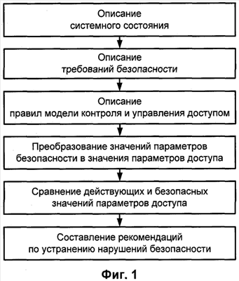 Затем сравнивают безопасные значения параметров доступа субъектов к объектам, сформулированные в описании требований безопасности, и действующие значения параметров доступа субъектов к объектам, полученные из действующих значений параметров безопасности системного состояния в результате обработки описания системного состояния по правилам, сформулированным в описании модели контроля и управления доступом, и определяют, какие значения параметров безопасности системного состояния необходимо изменить, чтобы система была защищенной, т.е. удовлетворяла требованиям безопасности.