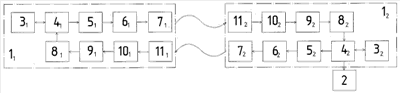 Предложенное техническое решение может быть реализовано с помощью устройства, структурная схема которого приведена на чертеже. Данное устройство включает в себя два модуля – информационно-управляющий модуль 11, информационно-исполнительный модуль 12 и электромеханическое исполнительное устройство 2. Каждый из модулей 11 и 12 содержит блок управления питанием 31 и 32, который связан двухсторонней связью с блоком кодирования-декодирования цифрового кода (микроконтроллер) 41 и 42 соответственно. Выход блока кодирования-декодирования цифрового кода 41(42) соединен с последовательно соединенными блоком модулятора 51(52), блоком усилителя модулированного сигнала 61(62) и блоком ультразвукового излучателя 71(72). Вторым входом блок кодирования-декодирования цифрового кода 41(42) соединен с последовательно соединенными блоком усилителя цифрового сигнала 81(82), блоком детектора 91(92), блоком фильтра 101(102) и блоком приемника ультразвуковых волн 111(112). При этом блок кодирования-декодирования цифрового кода (микроконтроллер) 42 информационно-исполнительного модуля 12 своим вторым выходом соединен с электромеханическим исполнительным устройством 2.