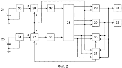 Устройство тревожной сигнализации (фиг.2) содержит первый и второй емкостные чувствительные элементы 24, 25, первый и второй генераторы 26, 27, настроенные на одинаковую частоту, блок сравнения 28 чисел, первый и второй интеграторы 29, 30 предупредительных сигналов, соединенные выходами с соответствующими исполнительными устройствами 31, 32. Емкостные чувствительные элементы выполняются и располагаются на объекте так же, как и в описанном первом варианте. Входы а частотозадающих цепей генераторов предназначены для подключения к ним емкостных чувствительных элементов непосредственно, если они расположены внутри помещений, или через устройства грозовой защиты 33, 34, если они размещены на периметре охраняемого объекта. Для синхронизации и формирования частотных последовательностей генераторы снабжены управляющими в входами, а для настройки и подстройки частоты, хотя бы один из генераторов снабжен вторым частотозадающим входом с. Для настройки генераторов на одинаковую частоту, устройство снабжено устройством 35 автоматической подстройки частоты (АПЧ), а для контроля настройки и срабатывания исполнительных устройств – блоком 36 световой индикации, позволяющим контролировать работу всего устройства без приборов. Блок сравнения 28 чисел соединен входами с выходами генераторов непосредственно или, для повышения чувствительности устройства, в случае большой емкости чувствительных элементов, через введенные умножители частоты 37, 38. Блок сравнения чисел соединен первым и вторым выходами с соответствующими первыми входами интеграторов 29, 30 предупредительных сигналов, третьим выходом – с вторыми их входами, с управляющими входами в генераторов 26, 27 и с первым входом устройства АПЧ, четвертым и пятым выходами соответственно – с вторым и третьим входами устройства 35 АПЧ и с первым и вторым входами блока 36 световой индикации, соединенного третьим и четвертым входами с соответствующими выходами интеграторов 29, 30 предупредительных сигналов и пятым – со вторым выходом устройства 35 АПЧ, первый выход которого соединен с входом с резисторной частотозадающей цепью генератора 27.