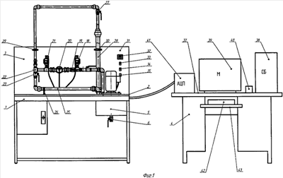 Устройство стендового автоматизированного лабораторного комплекса состоит из двух столов: стола 1, имеющего установочные поверхности, горизонтальную 2 и вертикальную 3, и также второго стола 4. На уровни горизонтальной установочной поверхности 2 размещен питательный бак 5, имеющий сливной кран 6. Над баком закреплены насосные станции 7 и 8, к которым вмонтированы трубы 9, 10, соединенные уголками 11 и 12, с трубами 13, 14 на которых располагаются краны 15, 16 соответственно. Далее водонапорная магистраль соединена при помощи тройника 17. После соединения последовательно установлены: преобразователь давления электронный КРТ-7 18, кран 19, счетчик воды 20, контрольный преобразователь давления электронный КРТ-7 21. Заканчивается горизонтальная часть трубопровода тройником 22, который разветвляет водонапорную магистраль на две трубы, на каждой из которой размещены краны 23 и 24. Трубопровод 25 поддерживается опорой 26. В верхней части трубопровода расположен предохранительный кран 27, ниже которого вмонтирована труба большего диаметра 28, предназначенная для устранения напора создаваемый спускающейся вниз водой. На вертикальной установочной поверхности 3 расположены: опоры 29, 30, индикатор сети 31, переключатели 32, 33, 34, 35, и панель 36 для снятия и обработки показаний в электронной вычислительной машине. На втором (правом) двухтумбовом столе 4, на горизонтальной поверхности 37 размещен системный блок 38 персонального компьютера, его монитор 39, звуковые колонки 40 и устройство многоярусного блока 41 из аналогово-цифровых преобразователей, клавишный блок 42 управления размещен на выдвижной панели 43 стола 4.