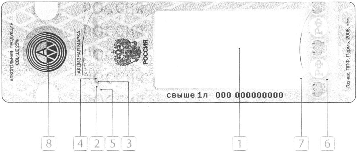 Акцизная марка содержит фольгу 6 с металлизацией медью, голографическим усложненным изображением, деметаллизированным рисунком 7, содержащим широкие и узкие элементы, недоступные воспроизведению с помощью блинтового тиснения. Для защиты оптически переменной краски от имитаций в марке применена краска, включающая публичный (визуальный) и кассовые уровни подлинности 8. Краска обладает изменением цветовых характеристик при изменении угла зрения, поляризационными свойствами, визуализируемыми через поляризационный фильтр, люминесцентным кинетическим эффектом с изменением цвета во времени.