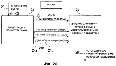 Фиг.2A изображает предпочтительную реализацию устройства для генерирования кодированного многоканального сигнала, представляющего некодированный многоканальный сигнал, содержащий N исходных каналов, которые подаются на вход 20 средства 22 для предоставления как М каналов передачи, так и параметрической информации с по меньшей мере двумя наборами параметров. В частности, количество М каналов передачи, выводимых на выходе 23 средства 22, меньше количества N исходных аудиоканалов. Индивидуальные наборы параметров, которые вместе представляют параметрическую информацию для восстановления К выходных каналов, подаются на выходы 24а, 24b, 24с средства 22 для предоставления М каналов передачи, причем М равно или больше 1 и меньше N, подаются на средство 25 для записи потока данных на выходной стороне, которые подаются на выход 26, точно как и наборы параметров на выходах 24а, 24b, 24с.
