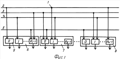 Способ записи информации предложенным способом иллюстрирован фиг.2 и табл.3 при N=4. На фиг.2 изображены одна из адресных шин 2, 3, 4 или 5 и два блока запоминающих элементов (К=2). Один из блоков состоит из трех запоминающих элементов 9 (P1=3), а другой – из пяти запоминающих элементов 9 (Р2=5). Пусть кодовая комбинация имеет вид 10112 (N=4). Тогда диапазон представления кодовых комбинаций D P1·P2=15, и заданная кодовая комбинация вписывается в диапазон D.
