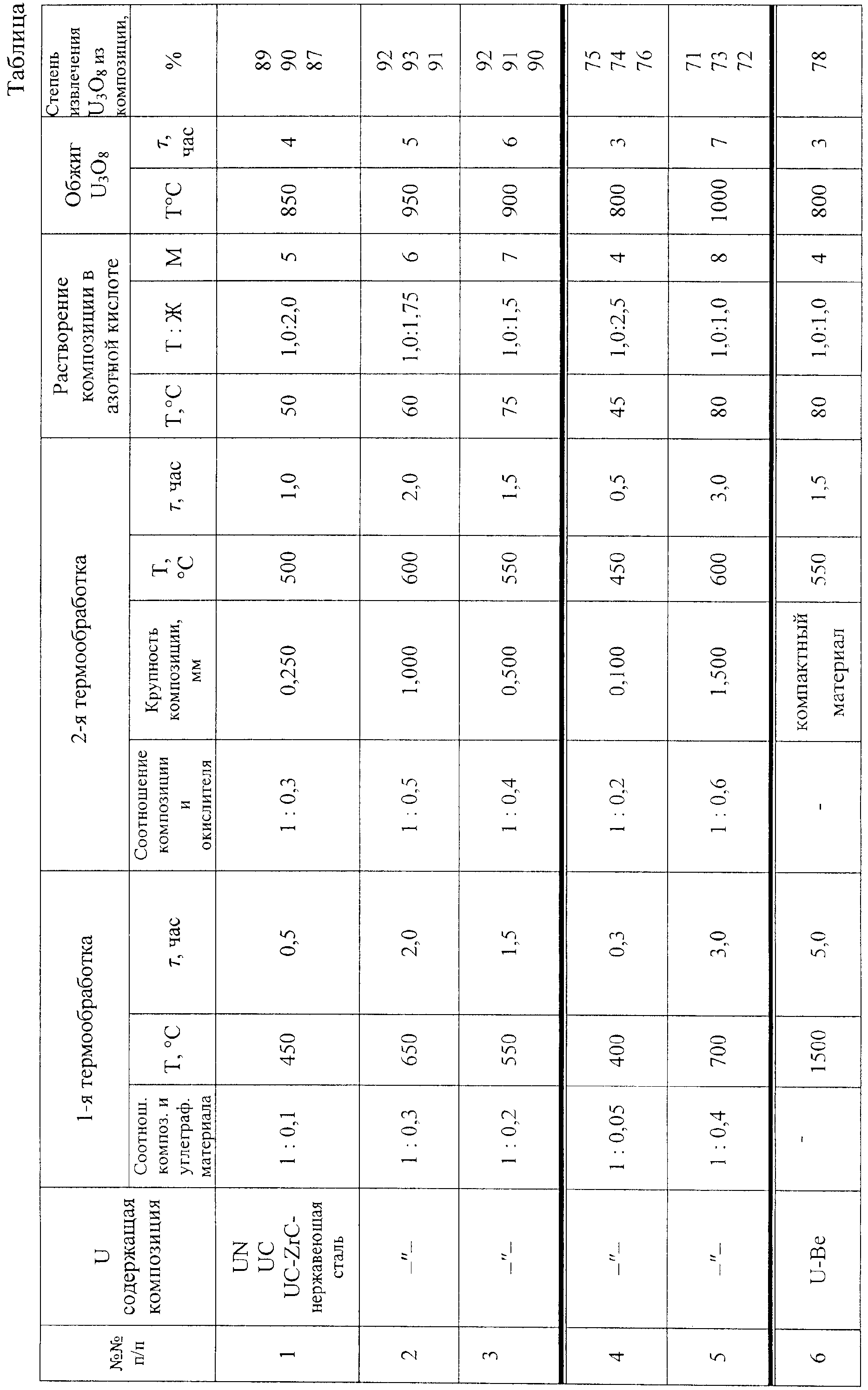 Способ переработки урансодержащих композиций, включающий первичную и повторную термическую обработку композиции на воздухе при температуре не менее 500°С в течение не менее часа, растворение образовавшейся закиси-окиси урана в азотной кислоте при повышенной температуре, пероксидное переосаждение полученного раствора уранилнитрата, фильтрацию раствора и обжиг твердого остатка на воздухе, отличающийся тем, что перед первичной термической обработкой урансодержащую композицию смешивают с углеграфитовым материалом в соотношении 1,0:0,1-0,3, первичную термическую обработку проводят при температуре 450-650°С в течение 0,5-2 ч, перед повторной термической обработкой образовавшийся продукт измельчают до крупности менее 1 мм и смешивают с окислителем в соотношении 1,0:0,3-0,5, после повторной термической обработки образовавшуюся закись-окись урана растворяют в 5-7-молярной азотной кислоте при температуре 50-75°С при соотношении твердой и жидкой фаз 1,0:1,5-2,0, а обжиг отфильтрованного продукта проводят при температуре 850-950°С в течение 4-6 ч.