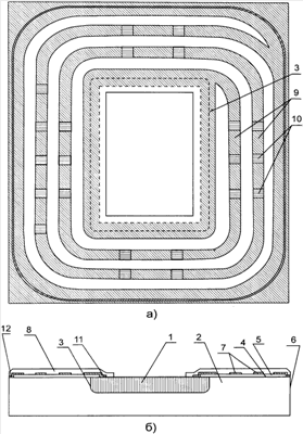 На фиг.1 а) и б) изображен диод на виде в плане а) и поперечном разрезе б), который содержит Р- (или N-) область 1 и N- (или Р-) область 2, образующие периферийный замкнутый P-N- (или N-P-) переход 3, выходящий на поверхность 4 периферии полупроводникового диода, покрытую диэлектрической пленкой 5, край кристалла 6, поликремневую спираль 7 с заданным шагом, диэлектрическую пленку 8, покрывающую спираль 7, Р- тип 9 и N- тип 10 проводимости вдоль спирали 7, которые могут чередоваться любое заданное число раз, образуя встречно включенные пары диодов Зенера. Один конец спирали 7 соединен с Р- (или N-) областью 1 периферии полупроводникового диода, а другой с N- (или Р-) областью 2 периферии полупроводникого диода невыпрямляющими контактами 11 и 12.