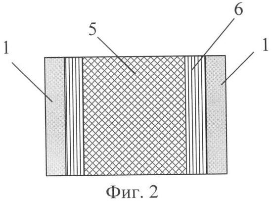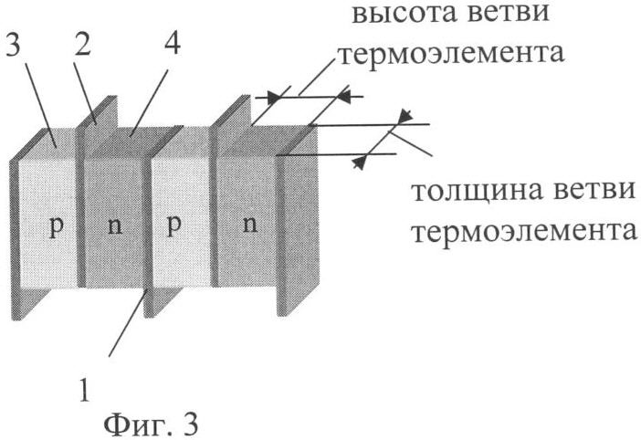Конструкция термоэлектрической батареи приведена на фиг.1-3. ТЭБ состоит из последовательно соединенных в электрическую цепь посредством коммутационных пластин 1 и 2 чередующихся ветвей, изготовленных соответственно из полупроводника p-типа 3 и n-типа 4. Электрическое соединение ветвей осуществляют посредством контакта ветвь p-типа 3 – коммутационная пластина 1 или 2 – ветвь n-типа 4, где ветвь p-типа 3 контактирует торцевой поверхностью с одной из поверхностей коммутационной пластины, а ветвь n-типа 4 – с другой. Каждая ветвь в ТЭБ контактирует противоположными торцевыми поверхностями с двумя коммутационными пластинами 1 и 2. Коммутационные пластины 1 и 2 имеют площадь, несколько большую, чем площадь поперечного сечения ветвей p- и n-типа 3 и 4, вследствие чего их концы выступают за поверхность структуры, образованной ветвями ТЭБ. Концы нечетных коммутационных пластин 1 выступают за одну поверхность структуры, а концы четных коммутационных пластин 2 – за другую.