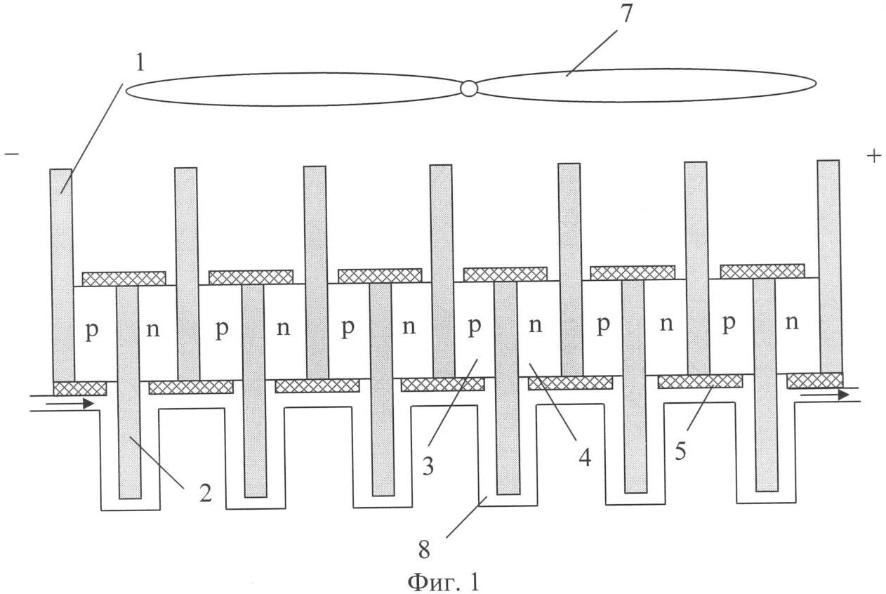 При прохождении через ТЭБ постоянного электрического тока, подаваемого от источника электрической энергии, между коммутационными пластинами 1 и 2, представляющими собой контакты ветвей p- и n-типа 3 и 4, возникает разность температур, обусловленная выделением и поглощением теплоты Пельтье. При указанной на фиг.1 полярности электрического тока происходит нагрев нечетных коммутационных пластин 1 и охлаждение четных 2. Съем теплоты с горячих коммутационных пластин, а также с близлежащих к ним областей осуществляется за счет принудительного воздушного теплообмена посредством вентилятора 7, а съем теплоты с охлажденных коммутационных пластин и близлежащих к ним областей производится за счет прокачивания жидкости в контактирующем с ними жидкостном теплообменнике 8.