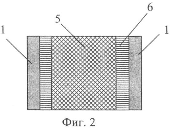 Поверхность структуры, образованной ветвями ТЭБ, за исключением областей, близлежащих к выступающим частям коммутационных пластин 1 и 2, покрыта слоем теплоизоляционного диэлектрического материала 5. Площадь, не покрытая слоем теплоизоляционного диэлектрического материала 5, определяется произведением толщины ветви термоэлемента на 1/4 ее высоты. Указанная поверхность, не покрытая слоем теплоизоляции, имеет профилированную боковую поверхность, выполненную с продольными канавками 6 (вид сверху единичного термоэлемента с профилированной поверхностью показан на фиг.2).
