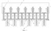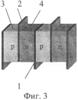 Конструкция термоэлектрической батареи приведена на фиг.1-3. ТЭБ состоит из последовательно соединенных в электрическую цепь посредством коммутационных пластин 1 и 2 чередующихся ветвей, изготовленных соответственно из полупроводника р-типа 3 и n-типа 4. Электрическое соединение ветвей осуществляют посредством контакта ветвь p-типа 3 – коммутационная пластина 1 или 2 – ветвь n-типа 4, где ветвь p-типа 3 контактирует торцевой поверхностью с одной из поверхностей коммутационной пластины, а ветвь n-типа 4 – с другой. Каждая ветвь в ТЭБ контактирует противоположными торцевыми поверхностями с двумя коммутационными пластинами 1 и 2. Коммутационные пластины 1 и 2, имеют площадь, несколько большую, чем площадь поперечного сечения ветвей р- и n-типа 3 и 4, вследствие чего их концы выступают за поверхность структуры, образованной ветвями ТЭБ. Концы нечетных коммутационных пластин 1 выступают за одну поверхность структуры, а концы четных коммутационных пластин 2 – за другую.