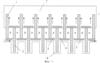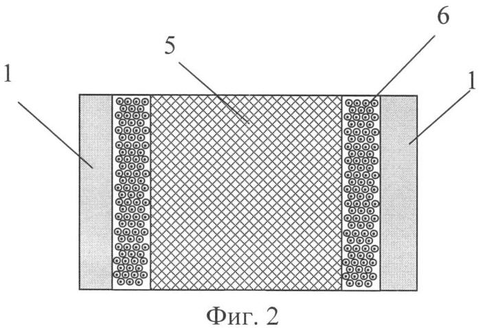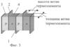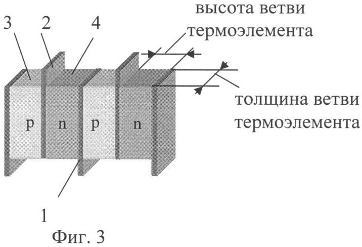 Конструкция термоэлектрической батареи приведена на фиг.1-3. ТЭБ состоит из последовательно соединенных в электрическую цепь посредством коммутационных пластин 1 и 2 чередующихся ветвей, изготовленных соответственно из полупроводника p-типа 3 и n-типа 4. Электрическое соединение ветвей осуществляют посредством контакта ветвь p-типа 3 – коммутационная пластина 1 или 2 – ветвь n-типа 4, где ветвь p-типа 3 контактирует торцевой поверхностью с одной из поверхностей коммутационной пластины, а ветвь n-типа 4 – с другой. Каждая ветвь в ТЭБ контактирует противоположными торцевыми поверхностями с двумя коммутационными пластинами 1 и 2. Коммутационные пластины 1 и 2 имеют площадь, несколько большую, чем площадь поперечного сечения ветвей p- и n-типа 3 и 4, вследствие чего их концы выступают за поверхность структуры, образованной ветвями ТЭБ. Концы нечетных коммутационных пластин 1 выступают за одну поверхность структуры, а концы четных коммутационных пластин 2 – за другую.