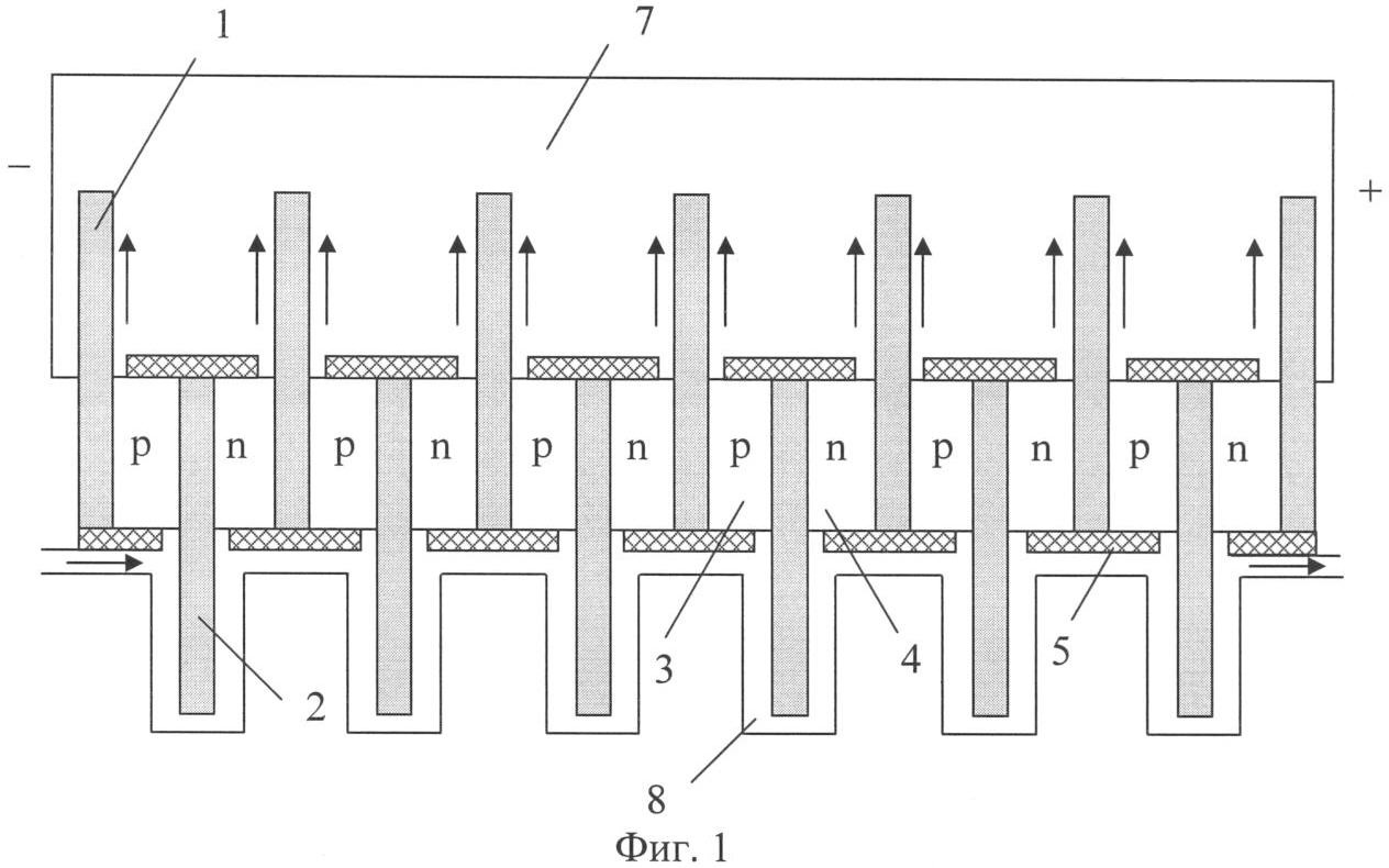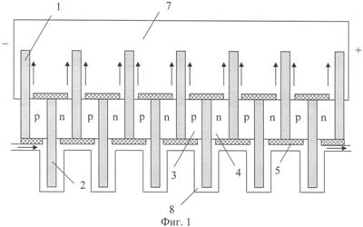 Цель достигается тем, что поверхность структуры, образованной ветвями ТЭБ, за исключением областей, близлежащих к выступающим частям коммутационных пластин, покрыта слоем теплоизоляционного диэлектрического материала. Площадь, не покрытая слоем теплоизоляционного диэлектрического материала, определяется произведением толщины ветви термоэлемента на 1/4 ее высоты. Указанная поверхность, непокрытая слоем теплоизоляции, имеет профилированную боковую поверхность, выполненную с выступающими шипами 6, расположенными в шахматном порядке. Съем теплоты с горячих коммутационных пластин, а также с близлежащих к ним областей осуществляется за счет испарительного охлаждения, реализуемого испарительной системой 7, а съем теплоты с охлажденных коммутационных пластин и близлежащих к ним областей производится за счет прокачивания жидкости в контактирующем с ними жидкостном теплообменнике 8.