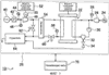 [0112] Перепускной канал 104 для охлаждающего вещества располагается параллельно основному каналу 102 для охлаждающего вещества. Охлаждающее вещество отбирается в этот перепускной канал 104 для охлаждающего вещества из канала выпускной стороны основного канала 102 для охлаждающего вещества, по которому охлаждающее вещество возвращается из батареи топливных элементов 22 в радиатор 110, и возвращается в канал впускной стороны основного канала 102 для охлаждающего вещества, по которому охлаждающее вещество протекает из радиатора 110 к батарее 22 топливных элементов. Перепускной канал 104 для охлаждающего вещества ведет во второй теплообменник 120 воздушного компрессора (АСР) 48, где выполняется теплообмен с каналом 80 для сжатого питающего газа, подаваемого из воздушного компрессора (АСР) 48 в батарею 22 топливных элементов через увлажнитель 54, после которого охлаждающее вещество возвращается в основной канал 102 для охлаждающего вещества. Соответственно, второй теплообменник 120 регулирует температуру питающего газа. Эта функция обычно выполняется независимой системой охлаждения, называемой промежуточным охладителем, однако в конструкции ФИГ. 11, аналогичной ФИГ.2, функция обычного промежуточного охладителя выполняется совместно охлаждающим веществом и системой охлаждения, которая проходит от радиатора 110 в батарею 22 топливных элементов.