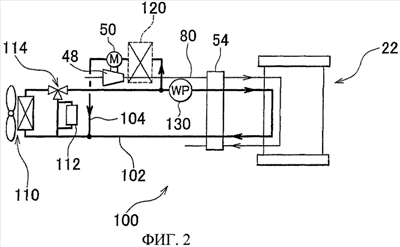 [0069] В канале впускной стороны основного канала 102 для охлаждающего вещества между входной стороной увлажнителя и выходной стороной в месте, где охлаждающее вещество входит в перепускной канал 104 для охлаждающего вещества, устанавливается циркуляционный насос 130. Как показано на ФИГ.2, увлажнитель 54 располагается на выходе циркуляционного насоса 130 и входе батареи 22 топливных элементов, а охлаждающее вещество, используемое теплообменником 120, отбирается на выходе радиатора 110 и входе циркуляционного насоса 130.