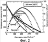На фигуре 2 продемонстрированы кривые зависимостей между удельной мощностью и напряжением элемента для примеров 1 и 2 и сравнительного примера 1. Как показано, для метанольного топливного элемента (пример 1) достигается пиковая удельная мощность 69 мВт/см2, для этанольного (пример 2) топливного элемента достигается пиковая удельная мощность 53 мВт/см2, а для водородного топливного элемента (сравнительный пример 1) достигается пиковая удельная мощность 80