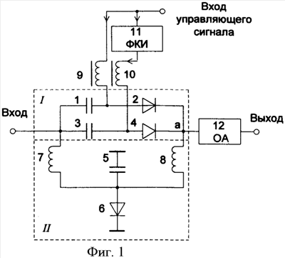 Фазовый манипулятор работает следующим образом. При положительном значении управляющего сигнала полупроводниковые диоды 2 и 6 открыты. В этом случае высокочастотный сигнал со входа манипулятора через П-образный фильтр верхних частот, образованный первой катушкой индуктивности 7, первым конденсатором 1 и второй катушкой индуктивности 8 поступает на вход ограничителя амплитуды высокочастотного сигнала (ОА) 12, выход которого является выходом манипулятора. При этом выходной сигнал после прохождения через фильтр верхних частот имеет опережение по фазе. При изменении значения управляющего сигнала от положительного отпирающего значения до нулевой величины в первом диоде 2 и втором диоде 6 происходят обратные переходные процессы, а третий диод 4 кратковременно открывается за счет подачи соответствующего управляющего сигнала с формирователя коротких импульсов (ФКИ) 11. После окончания переходных процессов П-образный фильтр верхних частот (первый конденсатор 1, первая и вторая индуктивности 7, 8) преобразуется в Т-образный фильтр нижних частот (первая и вторая индуктивности 7, 8, второй конденсатор 5) и выходной сигнал манипулятора имеет запаздывание по фазе. При этом относительная разность фаз составляет 180°.