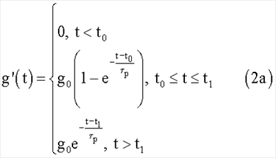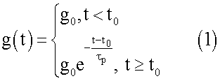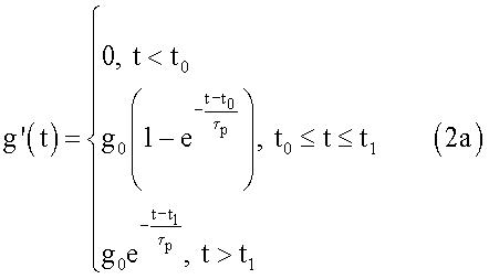 На фиг.2 показаны графики зависимости от времени проводимостей первого диода 2 и второго диода 6 (g(t) – сплошная кривая) и третьего диода 4 (g (t) – пунктирная кривая).