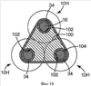 На фиг.17 и 18 показано размещение по меньшей мере трех трубчатых контактных узлов 10Н. Эти трубчатые контактные узлы 10Н могут быть идентичны показанным на фиг.1, 4, 14 или 15. Данное размещение по меньшей мере трех трубчатых контактных узлов 10Н можно использовать для размещения трехфазного силового кабеля. Как показано на фиг.18, в их узких средних частях, где первые усаживающиеся муфты 30 трех трубчатых контактных узлов 10Н усажены на соответствующие первые соединители 16, три трубчатых контактных узла 10Н соединены и расположены посредством позиционирующего элемента 100, имеющего три выходящих наружу приемных части 102 для приема трубчатых контактных узлов 10Н в первых трубчатых частях 34 первых усаживающихся муфт 30. Эти три трубчатых контактных узла 10Н размещены рядом друг с другом и соприкасаются друг с другом во вторых и третьих трубчатых частях их усаживающихся муфт 30. Соответственно, три трубчатых контактных узла 10Н размещены треугольным образом. Муфта 104 из ленты окружает позиционирующий элемент 100, а также первые трубчатые части 34 усаживающейся муфты 30 трех трубчатых контактных узлов 10Н, так что эти три трубчатых контактных узла 10Н размещены фиксированно. Вследствие заранее собранного состояния трех трубчатых контактных узлов 10Н можно разместить их так, как показано на фиг.17 и 18, чтобы соединять силовые кабели трехфазной сети, при этом трехфазные кабели можно размещать рядом друг с другом и лишь небольшое пространство нужно вокруг этих трехфазных кабелей при применении размещения трубчатых наконечников по фиг.17 и 18.