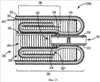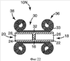 Фиг.22 показывает другой вариант осуществления заранее собранного трубчатого контактного узла 10N для сращения кабеля, имеющего свои части внутренней муфты 30, приспособленные проходить за связанные соответствующие наконечники 22, 24 и навитые так, чтобы обеспечить два проходящих по окружности рулона или витка, размещенных на первом соединителе 16. Вторая и третья трубчатые части 36 и 38 внутренней муфты 30 скатаны, как показано на фиг.16 для концевых частей наружной муфты, и могут закрепляться в своих состояниях посредством стопорных элементов, к примеру, образованных как кольцевые элементы, имеющие секции, помещенные между рулонами, и соединитель на своих наконечниках.
