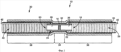 Со ссылкой на описанные варианты осуществления, но особенно со ссылкой на вариант осуществления, описанный на фиг.20, следует упомянуть, что внутреннюю муфту 30, содержащую наружный диэлектрический слой 32 и внутренний электропроводный слой, можно получать двумя разными путями. В этом контексте слова внутренняя и наружная относятся к установочному состоянию трубчатого контактного узла. Согласно первому пути выдавливают диэлектрический слой поверх электропроводного или полупроводникового слоя 32. Чтобы привести внутреннюю муфту 30 к виду, показанному на фиг.20, вторую трубчатую часть 38 муфты 30 отгибают назад поверх третьей трубчатой части 38 внутренней муфты 30, чтобы окружить первый соединитель 16. Вторую и третью трубчатые части 36 и 38 муфты 30 удерживают в их расширенных в радиальном направлении состояниях опорными сердечниками 39 и 40. Во время установки после введения кабелей в наконечник и удаления опорных сердечников 39 и 40 вторую трубчатую часть 36 отгибают назад в ее исходное состояние.