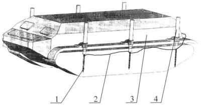 Пример реализации способа заземления передвижных радиоэлектронных станций показан на чертеже, где 1 – заземлители; 2 – провод заземления; 3 – базовая машина; 4 – гидроцилиндры, предназначенные для внедрения заземлителей в грунт.