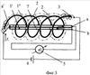 В варианте технического решения спираль 2 магнитопровода выполнен в виде замкнутой линии (фиг.6), а сердечник 1 выполнен из нескольких витков, расположенных внутри общей спирали 2. Схема соединений выводных концов аналогична фиг.1.