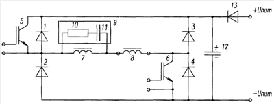Диодно-транзисторный мост содержит четыре диода 1, 2, 3, 4 и два транзистора 5, 6. В диагональ нагрузки последовательно включены дроссель 7, катушка 8 электромагнита. Параллельно дросселю 7 включена RC-цепочка 9 из резистора 10 и конденсатора И. В диагональ питания включен конденсатор 12 и, через разделительный диод 13, источник питания (не показан). При этом катод разделительного диода 13 соединен с катодами диодов 1 и 3. Анод разделительного диода 13 подключен к положительному выводу источника питания.