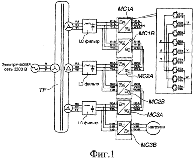 Многообмоточный трансформатор TF имеет три вторичные обмотки, обеспечивающие разность фаз одной относительно другой. Каждая вторичная обмотка соединена со сторонами питания двух соединенных параллельно контуров прямого преобразования переменного тока МС1А и МС1В, МС2А и МС2В, МС3А и МС3В через LC фильтры. Каждый LC фильтр служит для подавления высших гармоник входных и выходных токов между двумя соединенными параллельно контурами прямого преобразования переменного тока и источником питания переменного тока.