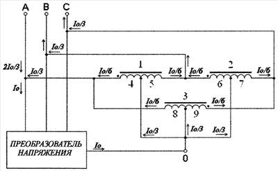 Устройство содержит три однофазных трансформатора 1, 2 и 3 с обмотками соответственно 4, 5, 6, 7 и 8, 9. Указанные обмотки соединены последовательно, а их числа витков равны. Конец (начало) обмотки 4 (8) трансформатора 1 (3) подключен к входному выводу фазы А. Конец (начало) обмотки 6 (5) трансформатора 2 (1) подключен к входному выводу фазы В. Конец (начало) обмотки 9 (7) трансформатора 3 (2) подключен к входному выводу фазы С. Общие точки разноименных выводов пар обмоток 4, 5; 6, 7 и 8, 9, составляющих каждая пара соответствующую фазную обмотку, соединены с нулевым входным выводом 0, с которым соединен провод для протекания тока нулевой последовательности вышеуказанного трансформаторного преобразователя трехфазного переменного напряжения.