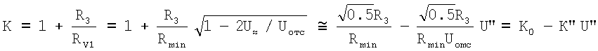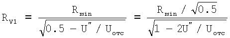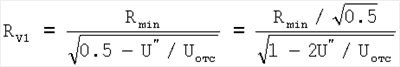где Rmin – минимальное сопротивление канала при UЗИ=0 (Rmin=200÷1000 Ом), UЗИ – модуль отрицательного напряжения затвора относительно истока, Uотc – напряжение отсечки тока транзистора. Если на затворе V1 задано напряжение UЗИ=Uотс/2+U” и U”<отс, то сопротивление RV1 транзистора V1 имеет вид
