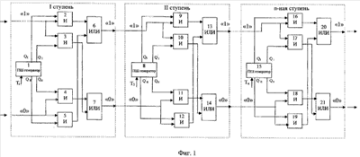 Вторая и последующие ступени устройства формирования сложных квазиоптимальных сигналов построены по аналогичной схеме. Информационные входы «1» и «0» соединены с соответствующими информационными выходами «1» и «0» предшествующих ступеней. На вход генераторов 8, 15 псевдошумового кода второй и последующих ступеней подаются тактовые импульсы Т2, Tn и генерируются первая и вторая комбинации псевдошумового кода. Комбинации псевдошумового кода с прямых QI, QII и инверсных Q I, Q II выходов генераторов 8, 15 подаются на схемы «И» 9, 10, 11, 12 второй и 16, 17, 18, 19 последующих ступеней. Информационные входы «1» второй и последующих ступеней соединены с первыми входами первой 9, 16 и второй 10, 17 схем «И». Информационные входы «0» второй и последующих ступеней соединены с первыми входами третьей 11, 18 и четвертой 12, 19 схем «И». Прямые выходы первой комбинации псевдошумового кода QI генераторов 8, 15 соединены со вторыми входами первых схем «И» 9, 16. Инверсные выходы первой комбинации псевдошумового кода Q I генераторов 8, 15 соединены со вторыми входами вторых схем «И» 10, 17. Прямые выходы второй комбинации псевдошумового кода QII генераторов 8, 15 второй комбинации соединены со вторыми входами третьих схем «И» 11, 18. Инверсные выходы второй комбинации псевдошумового кода Q II генераторов 8, 15 соединены со вторыми входами четвертях схем «И» 12, 19. Во второй и последующих ступенях выходы первых 9, 16 и четвертых 12, 19 схем «И» соединены, соответственно, с первым и вторым входами первых схем «ИЛИ» 13, 20. Также, во второй и последующих ступенях выходы третьих 11, 18 и вторых 10, 17 схем «И» соединены, соответственно, с первым и вторым входами вторых схем «ИЛИ» 14, 21. Выходы первых схем «ИЛИ» 13, 20 являются выходами «1» для второй и последующих ступеней формирования сложного квазиоптимального сигнала. Выходы вторых схем «ИЛИ» 14, 21 являются выходами «0» для второй и последующих ступеней формирования сложного квазиоптимального сигнала и входом второй ступени формирования сигнала. При наличии последующих ступеней выходы «1» и «0» являются также и входами ступеней формирования сигнала. Для последней ступени выходы «1» и «0» являются выходами устройства формирования сигнала.