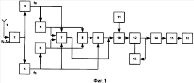fc и зеркального fз каналов приема. С выходов полосовых фильтров 3 и 4 сигналы на частотах fc и fз поступают соответственно на входы первого 5 и второго 6 измерителей отношения сигнал/шум, а также на первый и второй сигнальные входы электронного коммутатора 7. Кроме того, с выхода полосового фильтра 4 сигнал подается на сигнальный вход ключа 9. На выходе измерителей 5 и 6 отношений сигнал/шум вырабатываются управляющие напряжения, пропорциональные отношениям сигнал/шум в основном и зеркальном каналах, которые подаются соответственно на первый и второй управляющие входы электронного коммутатора 7, а также на два входа блока 8 сравнения. Электронный коммутатор 7 в соответствии с управляющими напряжениями, поступающими на его первый и второй управляющие входы, обеспечивает прохождение на его выход сигналов, поступающих на сигнальные входы с основного и зеркального каналов, с большим отношением сигнал/шум. В зависимости от электромагнитной обстановки это может быть сигнал или на частоте основного fc или зеркального fз каналов приема. Сигнал на частоте fc или fз с большим отношением сигнал/шум с выхода электронного коммутатора 7 поступает на первый вход смесителя 10 и с помощью гетеродина 11 преобразуется на промежуточную частоту fпp. После усиления сигнала усилителем 12 промежуточной частоты осуществляется детектирование сигнала детектором 14 и усиление продетектированного сигнала в усилителе 15 частоты модуляции, после чего низкочастотный сигнал, содержащий полезную информацию, регистрируется оконечным устройством 16. Сигнал на промежуточной частоте с выхода усилителя 12 промежуточной частоты поступает на схему 13 АРУ, на выходе которой вырабатывается управляющее напряжение Uупp, которое подается на второй вход усилителя промежуточной частоты, обеспечивая необходимую регулировку его коэффициента усиления.