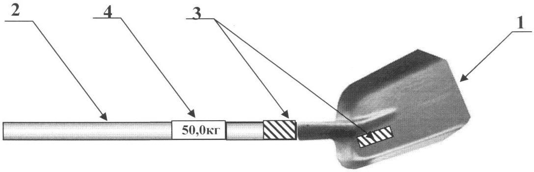 На чертеже показано конструктивное устройство лопаты, где 1 – рабочий орган (савок, ковш), 2 – черенок (рукоятка) и весовое устройство, состоящее из датчика веса 3 и весового индикатора 4.