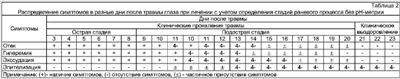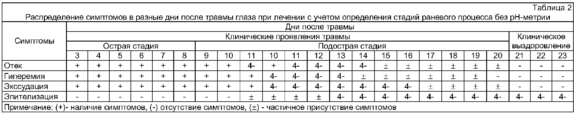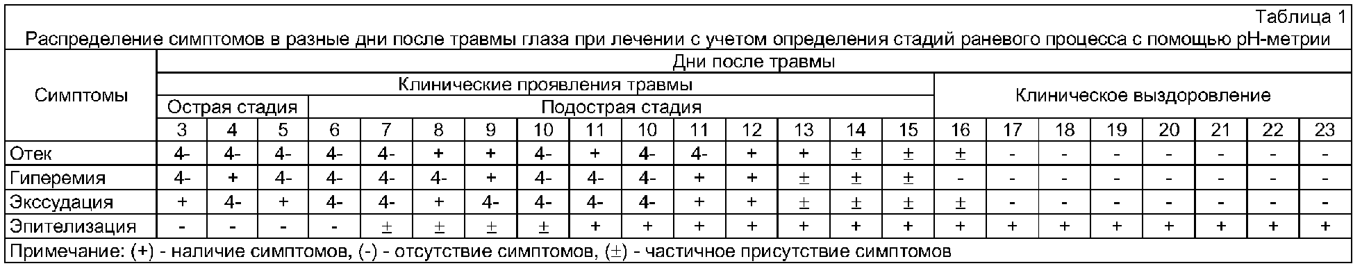 Всего проведено исследование 19 (19 глаз) лабораторных взрослых кроликов породы Шиншилла с моделью травмы, выполненной методом перфорации глаза, и дальнейшее их лечение. Показана наибольшая эффективность при лечении под контролем, предусматривающим динамическое определение pH в экссудативной жидкости раны методом pH-метрии. Таблица 1; 2.
