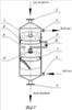 Абсорбент из кармана 8 через переливной патрубок 9 при помощи нагнетателя 10 поступает в распределитель 11. Поток абсорбента делится на 2 части: периферийная часть потока поступает в полость, образованную между втулкой 13 и регулировочным кольцом 15; центральная часть потока поступает в полость, образованную между втулкой 14 и кольцом 16. Абсорбент, поступающий в полости, создает внутреннее избыточное давление, свободно прилегающие к втулкам 13 и 14 кромки регулировочных колец 15 и 16 деформируются, образуются кольцевые щели, через которые жидкость истекает в виде пленочного купола. В жидкостных куполах штифты 18 и 19 образуют диаметрально противоположные секторные окна для организованного прохода жидкости. Жидкость, истекающая в виде двух пленочных куполов, сливается в нижний карман 8 следующей секции. Газ с примесями, подаваемый в корпус 1 снизу, поднимается, контактирует с пленкой жидкости, перекрывающей сечение корпуса, очищается от примесей и выходит из корпуса. Регулирование толщины и скорости истечения пленочного купола осуществляется за счет изменения величины избыточного давления внутри полости, образованной втулками и регулировочными втулками. В результате контакта газа с пленкой жидкости образуется слой интенсивной турбулентности и процессы абсорбции примесей проходят более интенсивно.