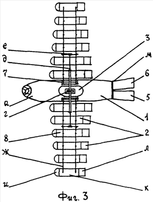 Орнитоптер выводят на взлетную площадку, где производят загрузку фюзеляжа 1, имеющего шасси 4, кабину а экипажа, дверь б, окна в, например, мешками с песком. Включают двигатель привода механизма 3 взмаха крыльев 2. При этом штанга г, совершающая возвратно-поступательные движения, через жесткие звенья д и шарниры е передает усилия раме ж, заставляя крылья поворачиваться на оси 7. Закрашенные на раме, имеющей ребра з жесткости, желоба 8 начинают подниматься и опускаться. При этом окружающая воздушная среда оказывает на выпуклую сторону желобов меньшее давление, чем на вогнутую. Вследствие разницы давлений возникает подъемная сила. Подъемная сила, создаваемая отдельным желобом, обеспечивается полуцилиндром к (условно вертикальное перемещение), 1/4 сферы и и концевой его частью л (вертикальное и горизонтальное перемещение). Таким образом, в зависимости от частоты взмаха крыльев орнитоптер может не только зависать в воздухе, но и двигаться вперед. Управляя рулями 5 и 6, имеющими возможность поворота на оси м, можно отклонить траекторию движения орнитоптера влево или вправо.