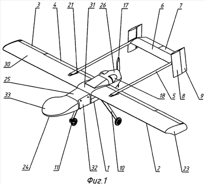 Беспилотный летательный аппарат содержит (см. фиг.1) фюзеляж 1 с двумя хвостовыми балками 5. Силовая часть фюзеляжа выполнена (см. фиг.2) в виде металлической фермы 20 и содержит отсек 13 с БРЭО и отсек 14 с основным топливным баком. К силовой части фюзеляжа прикреплены: в носовой части – ферма с отсеком 12 целевой нагрузки, в хвостовой части – моторная рама 15, на которой установлен двигатель 16 с пропеллером 17, сверху в средней части – лонжероны 28 крыльев, снизу спереди – переднее шасси 11, снизу в средней части – основное шасси 10.