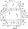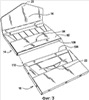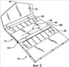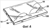 Как это показано на фиг.5, первая картонная заготовка 10 имеет закрывающий клапан 18, выходящий с одной из ее сторон, и нижнюю створку 30, идущую от ее противоположной стороны. На боковых сторонах первой картонной заготовки 10 пара боковых створок 32 и 34 идет в противоположных направлениях. Остальной центральный участок первой картонной заготовки 10 образует заднюю панель 35 для верхнего отделения 14. Первая картонная заготовка 10 изготовлена из SBS (твердый отбеленный сульфат) картона, частично по причине хороших свойств сгибания этого материала. Альтернативно, отделения 14 и 16 могут быть образованы из другого подходящего материала, такого как поливинилхлорид (ПВХ). Картонный материал может иметь покрытие эмульсией белой глины на своей внешней стороне и может не иметь покрытия на своей внутренней стороне. Покрытие улучшает качество печати на картоне, причем операция печати может быть осуществлена ранее описанных далее операций резки, гибки и сборки. На печатную сторону может быть также нанесен голографический материал.