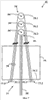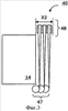 – там ремни ременной группы 56 отклоняются, проходят между одной боковой стенкой кабины лифта и одной боковой стенкой шахты лифта и, совершая дальнейший поворот вокруг своих соответствующих продольных средних осей L, проходят вверх к отдельным блокам второй многоосной неподвижной блочной группы 58, расположенной в данном примере также в верхней части шахты;
