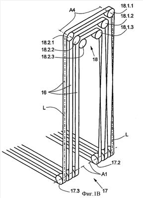 На фиг.1В в виде увеличенного фрагмента из фиг.1А изображено реальное устройство из ремней 16 и несуще-огибных блоков в зоне, включающей в себя одну неподвижную (многоосную) блочную группу 18 с отдельными блоками 18.1.1-18.2.3 и два (коаксиальных) блочных узла 17.2, 17.3 подвижной, т.е. относящейся к кабине 14 лифта, кабинной блочной группы 17.