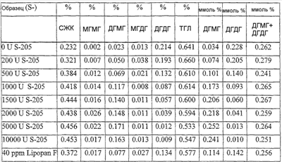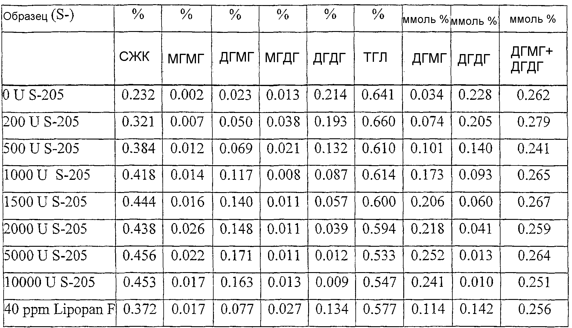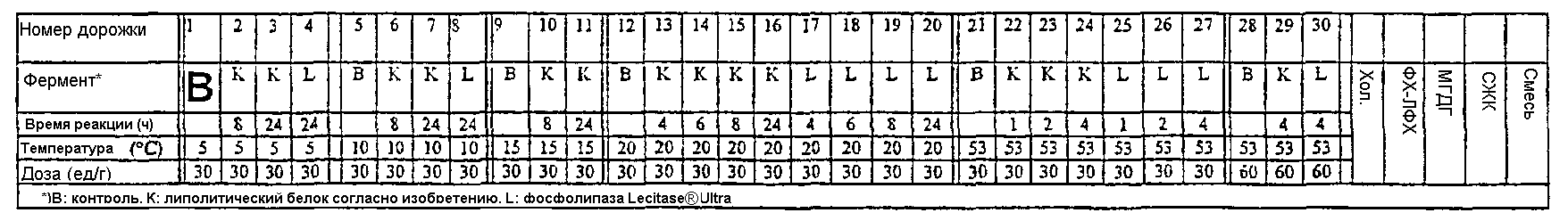 Эта проблема, связанная с высокой активностью по отношению к триглицеридам, обсуждается в заявке WO 02/094123, авторами которой было обнаружено, что улучшение функциональных свойств может быть достигнуто путем выбора липолитических ферментов, являющихся активными по отношению к полярным липидам (гликолипидам и фосфолипидам), присутствующих в тесте, но, в основном, не активными по отношению к триглицеридам или 1-моноглицеридам.