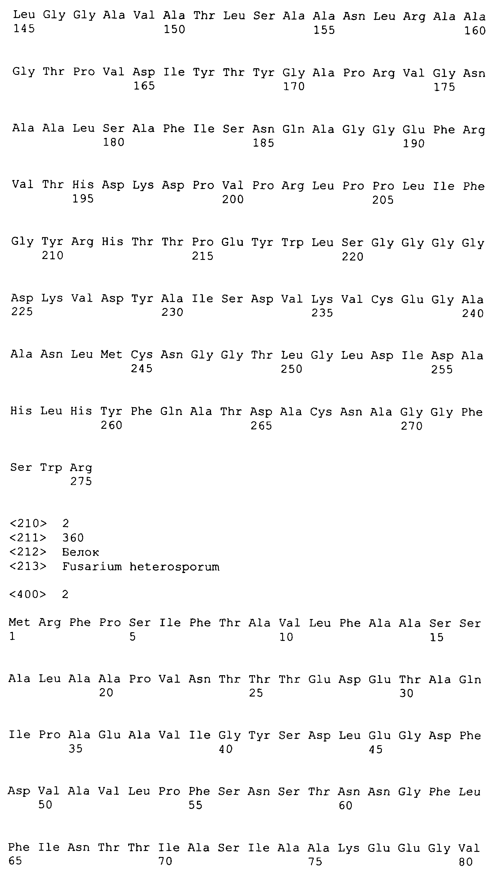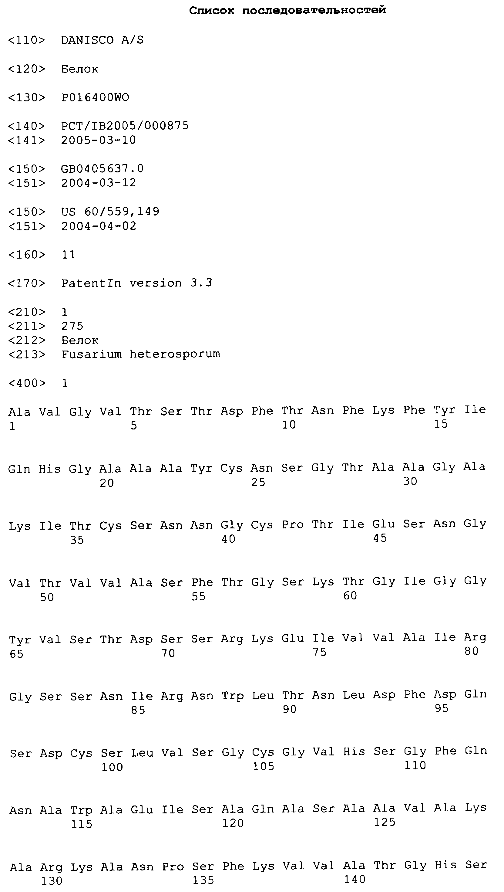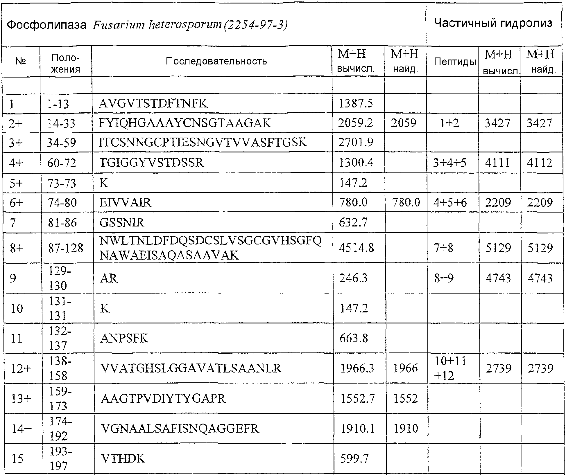 В WO 02/00852 описаны пять липазных ферментов и кодирующих эти ферменты полинуклеотидов, выделенных из F.venenatum, F.sulphureum, A. berkeleyanum, F. culmorum и F. solani. Все эти пять ферментов описаны как ферменты, обладающие триацилглицерин-гидролизующей активностью, фосфолипазной активностью и галактолипазной активностью. Из них, три фермента обладают активностью, эквивалентной активности фермента F.oxysporum, описанного в ЕР 0869167: F. venenantum, F. sulphureum, F. culmorum.