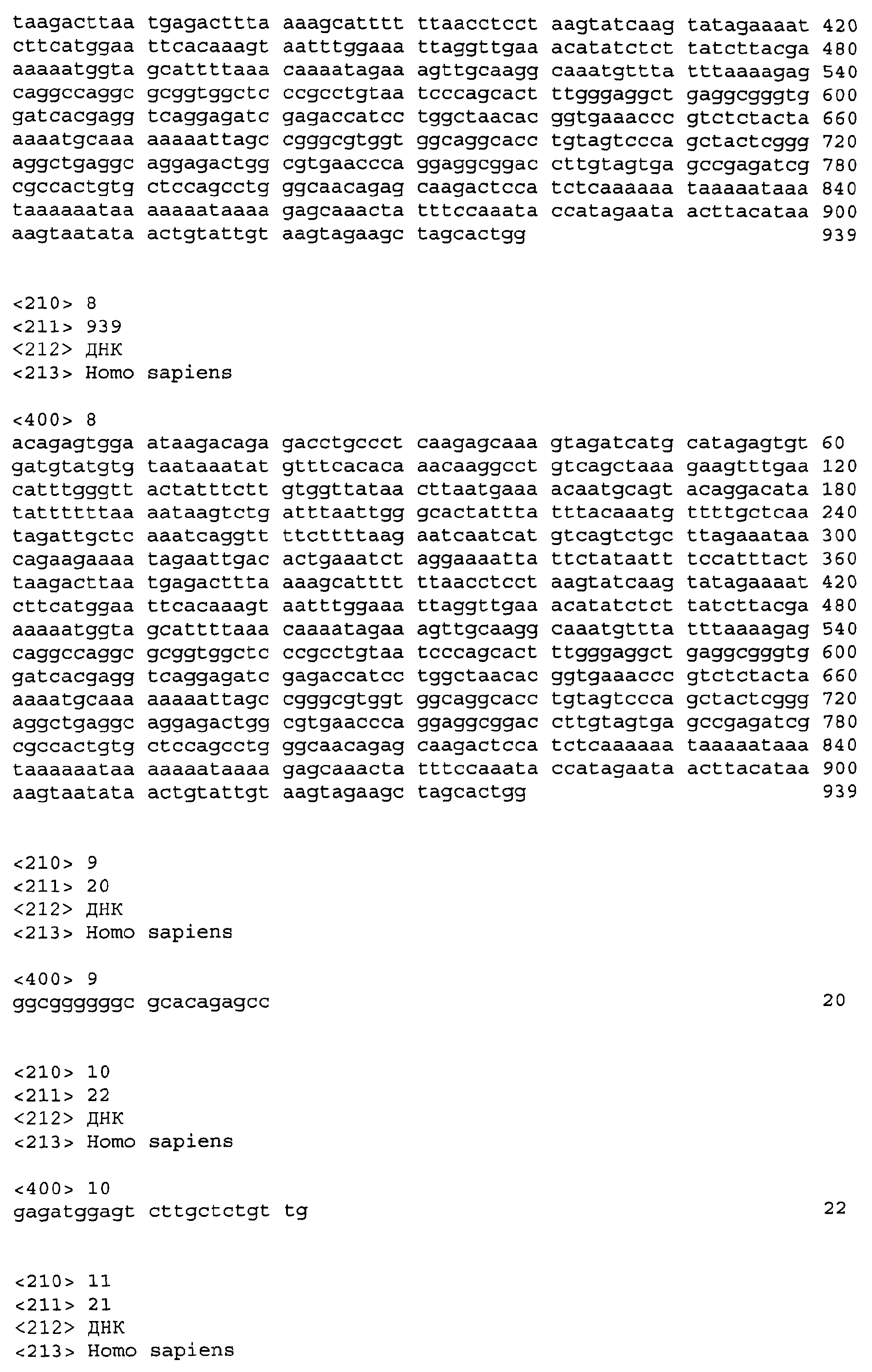 Полинуклеотидная последовательность фрагмента человеческого гена PAR1 в 5’/3′-структуре с полиморфизмом в положении 3090 последовательности согласно NM_001992, состоящим из замены Т на С, а также с одновременно имеющимся вторым полиморфизмом в положении 3329 последовательности согласно NM_001992, состоящим из замены А на С. Представленная последовательность идентична SEQ ID 8.