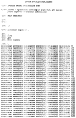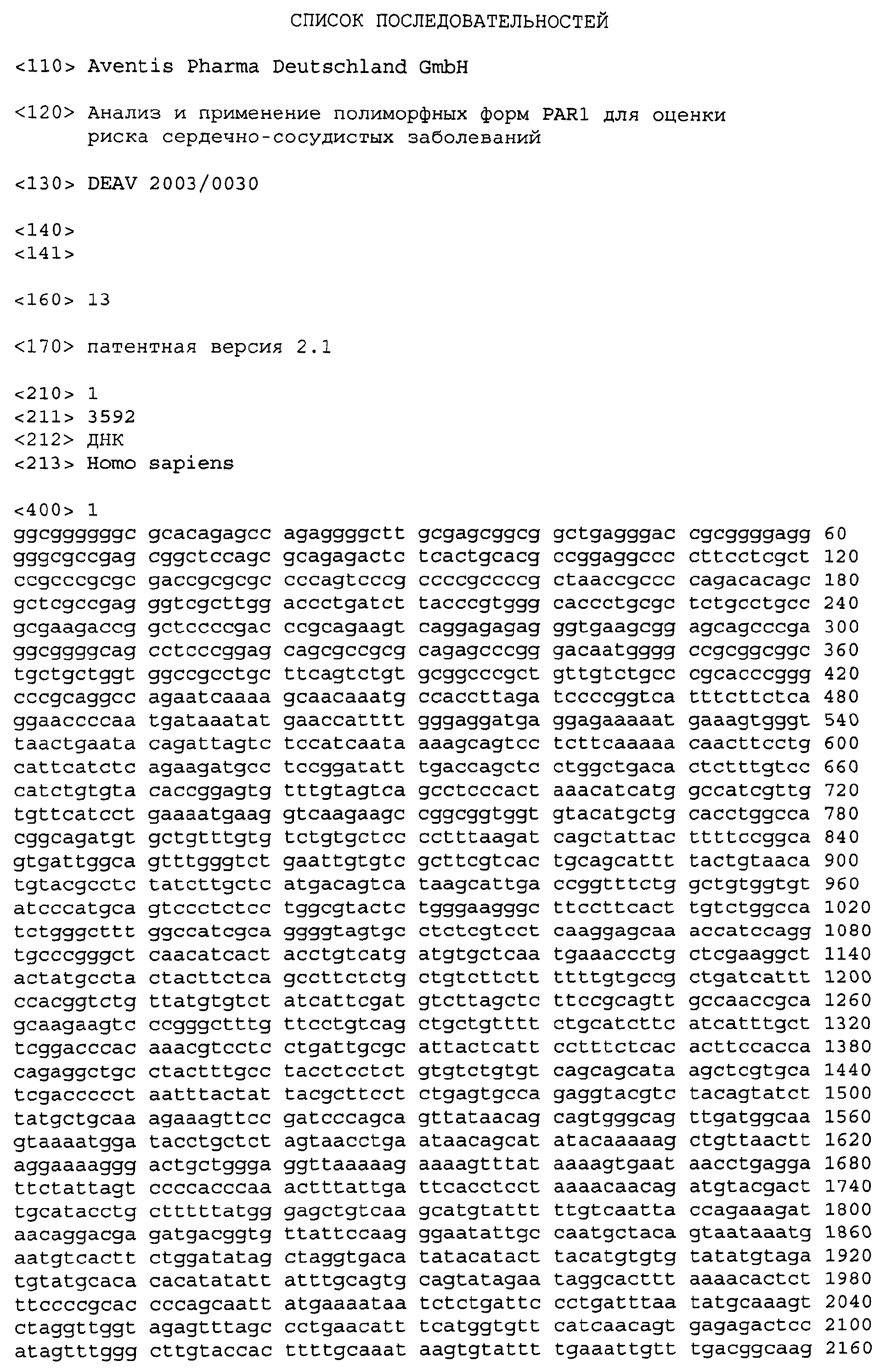 Изобретение относится, далее, к выделенной полинуклеотидной последовательности гена PAR1, которая отличается тем, что в положении 3329 последовательности PAR1 согласно NM_001992, которая известна как уровень техники, имеется замена А на С. Согласно предпочтительному варианту осуществления полинуклеотидная последовательность гена PAR1 с заменой А на С в положении 3329 включает последовательность согласно SEQ ID 3, и согласно особенно предпочтительному варианту этой полинуклеотидной последовательности она состоит из последовательности, соответствующей SEQ ID 3.