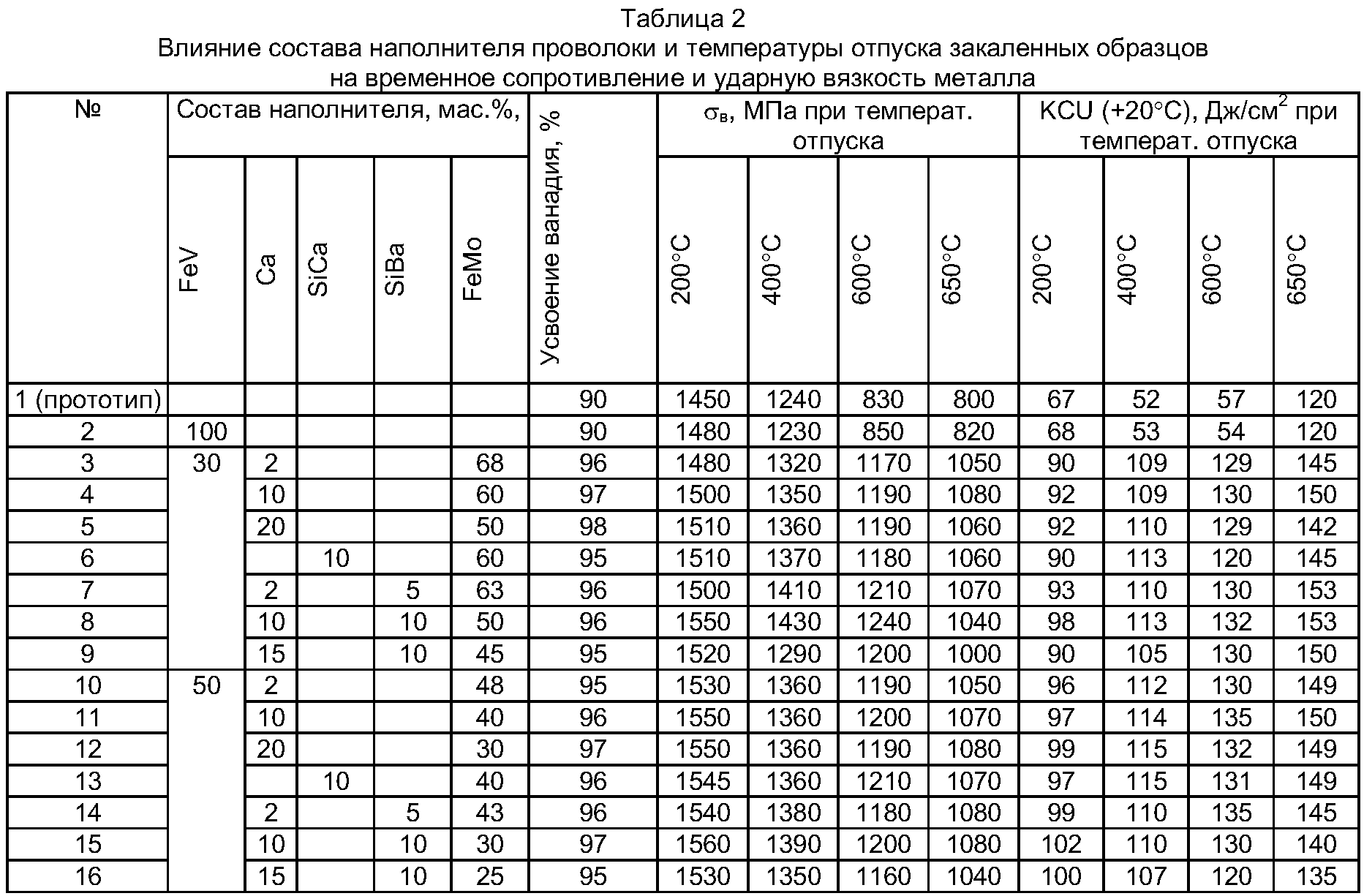 Изобретение относится к черной металлургии, а именно к микролегированию сталей ванадием при внепечной обработке расплава порошковой проволокой. По первому варианту проволока состоит из стальной оболочки и наполнителя, содержащего ванадий в виде феррованадия и добавку в виде металлического кальция и/или силикокальция или смеси металлического кальция и/или силикокальция с силикобарием при следующем соотношении компонентов, мас.%: феррованадий 80-98, добавка 2-20. По второму варианту наполнитель содержит ванадий в виде феррованадия, добавку в виде металлического кальция и/или силикокальция или смеси металлического кальция и/или силикокальция с силикобарием и ферромолибден при следующем соотношении компонентов, мас.%: феррованадий 30-50, добавка 2-20, ферромолибден 30-68. Изобретение по первому варианту позволяет повышать пластические и вязкостные свойства стали, а также повышает степень усвоения ванадия, а по второму варианту уменьшает концентрацию молибдена в стали с повышенной устойчивостью к проявлению отпускной хрупкости. 2 н.п. ф-лы, 2 табл.