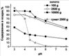 График показывает, что извлечение золота в концентрат обеспечивается при ускорении g центрифугирования от 2500 до 10000 при значениях рН=4.5-8.0. При этом при рН=4.5-6 в осадке после центрифугирования концентрируется 65-90% золота, а совместно с обогащенными золотом органоминеральными фракциями осаждается 2-17% гуминовых веществ.