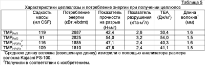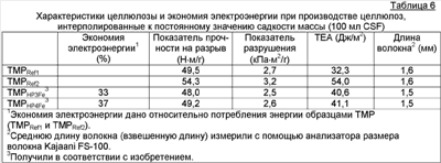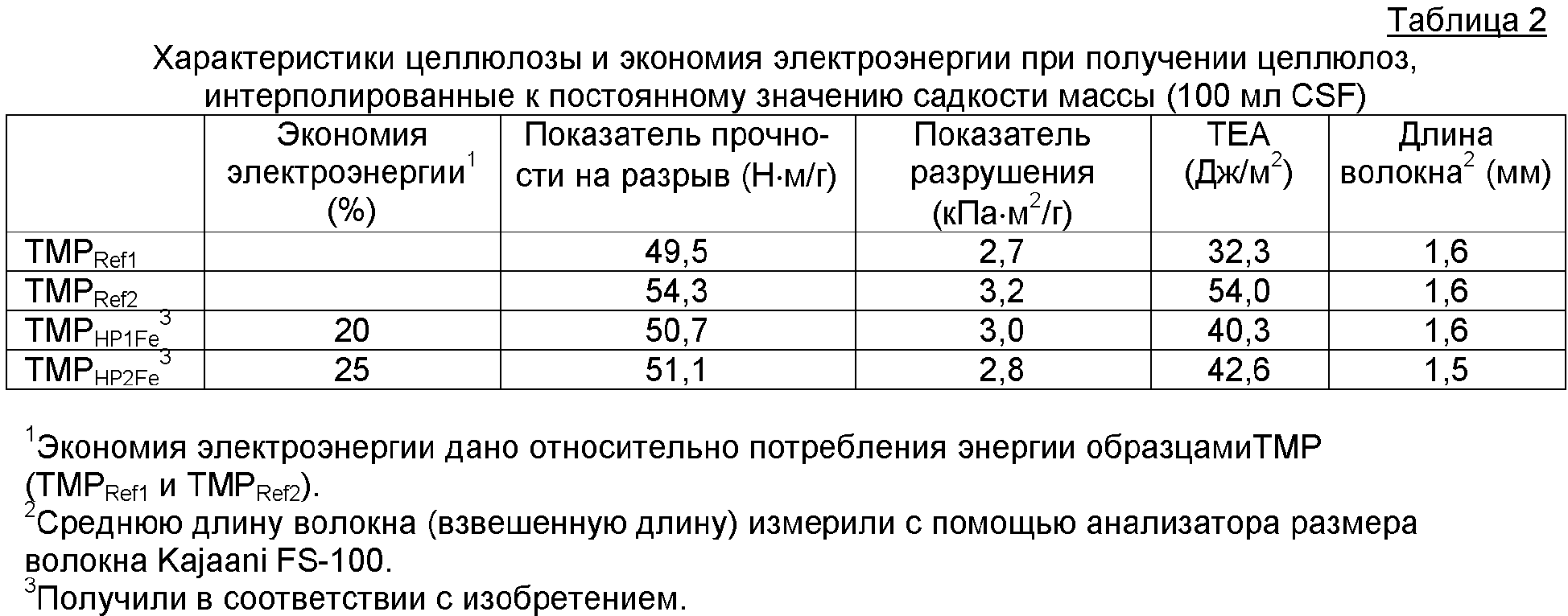 На фиг.5 видно, что большую экономию электроэнергии вплоть до 37% (на уровне садкости 100 мл CSF) возможно получить только с 2 % по массе пероксида водорода в соответствии со способом, описанном в изобретении. Свойства прочности (показатель прочности на разрыв, TEA) полученных целлюлоз лучше или эквивалентны свойствам прочности TMPRef1 (сравните таблицы 5-6), и не получили ни какого ухудшения характеристик длины волокна и ширины волокна (сравните фиг.2-3). Возможность экономии этого количества электрической энергии без потери свойств прочности полученной целлюлозы замечательна.